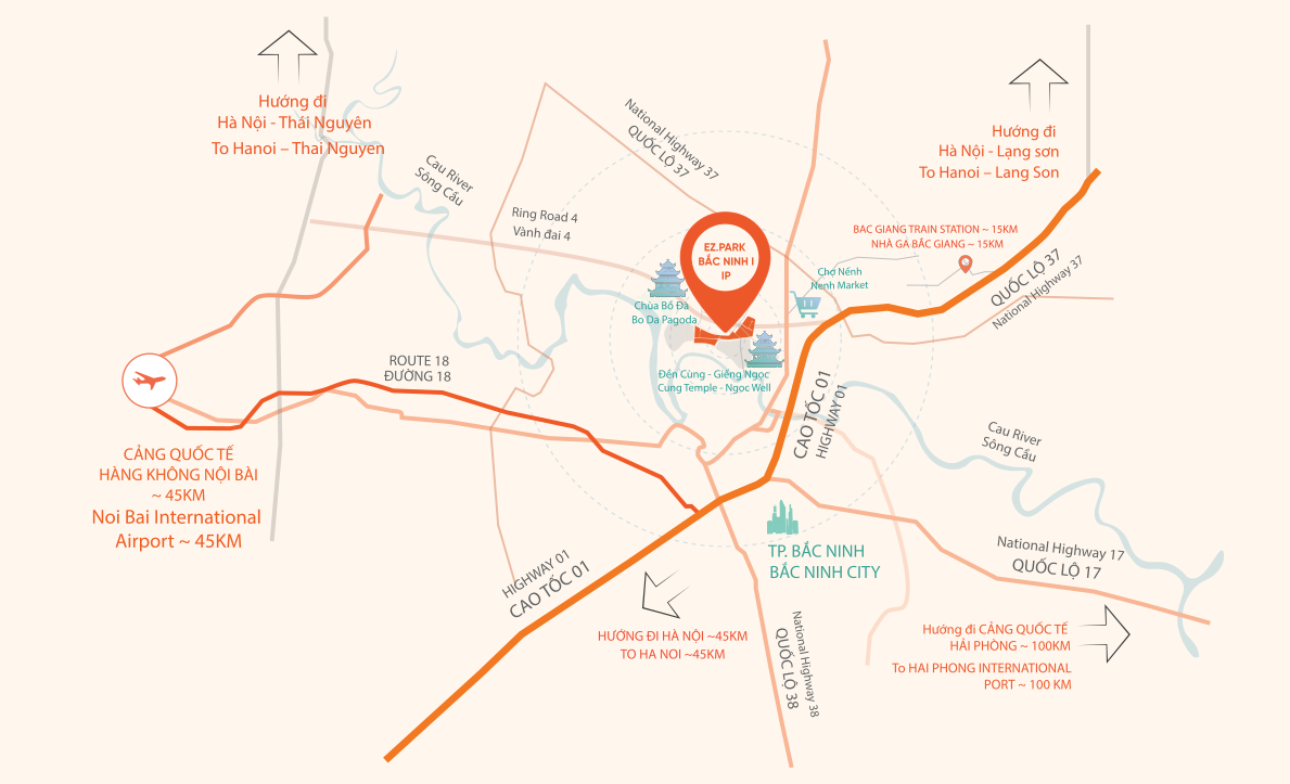 • Hạ tầng giao thông đa phương thức: Hệ thống cao tốc Hà Nội – Bắc Giang cũ -Lạng Sơn, đường Vành đai 4, quốc lộ 1A, quốc lộ 18 cùng mạng lưới logistics đường bộ – hàng không – cảng biển lân cận giúp doanh nghiệp tối ưu chi phí vận chuyển và kết nối nhanh với chuỗi cung ứng toàn cầu.